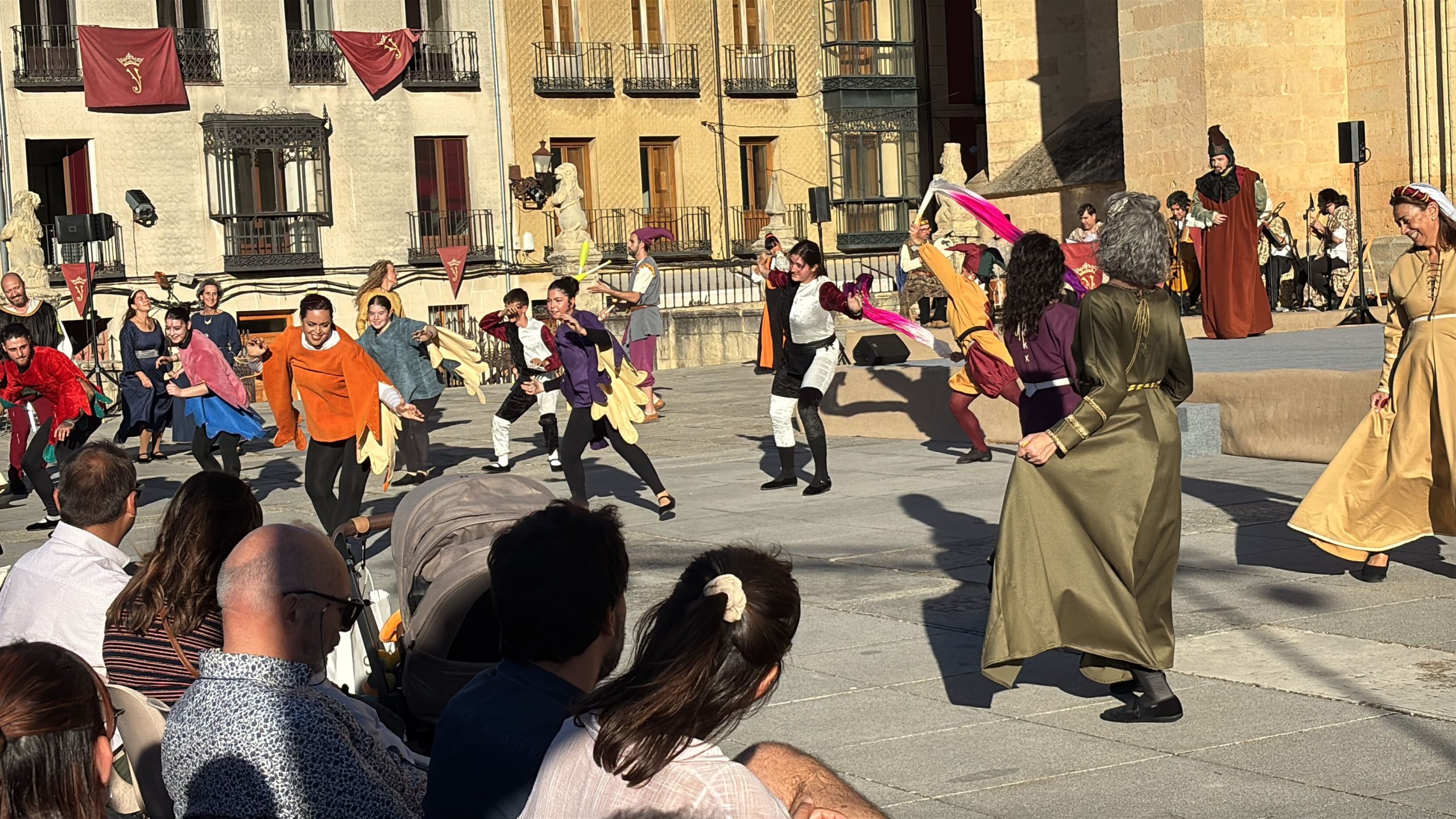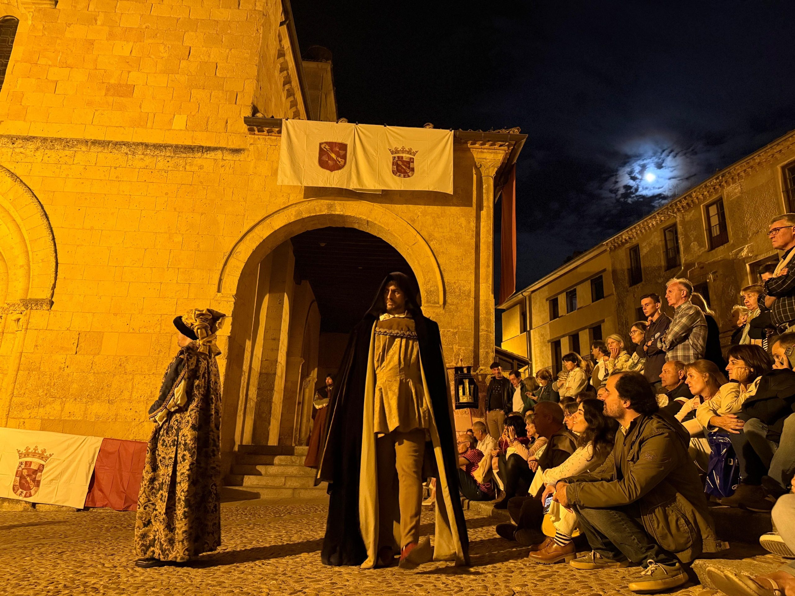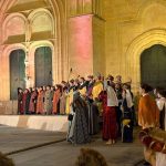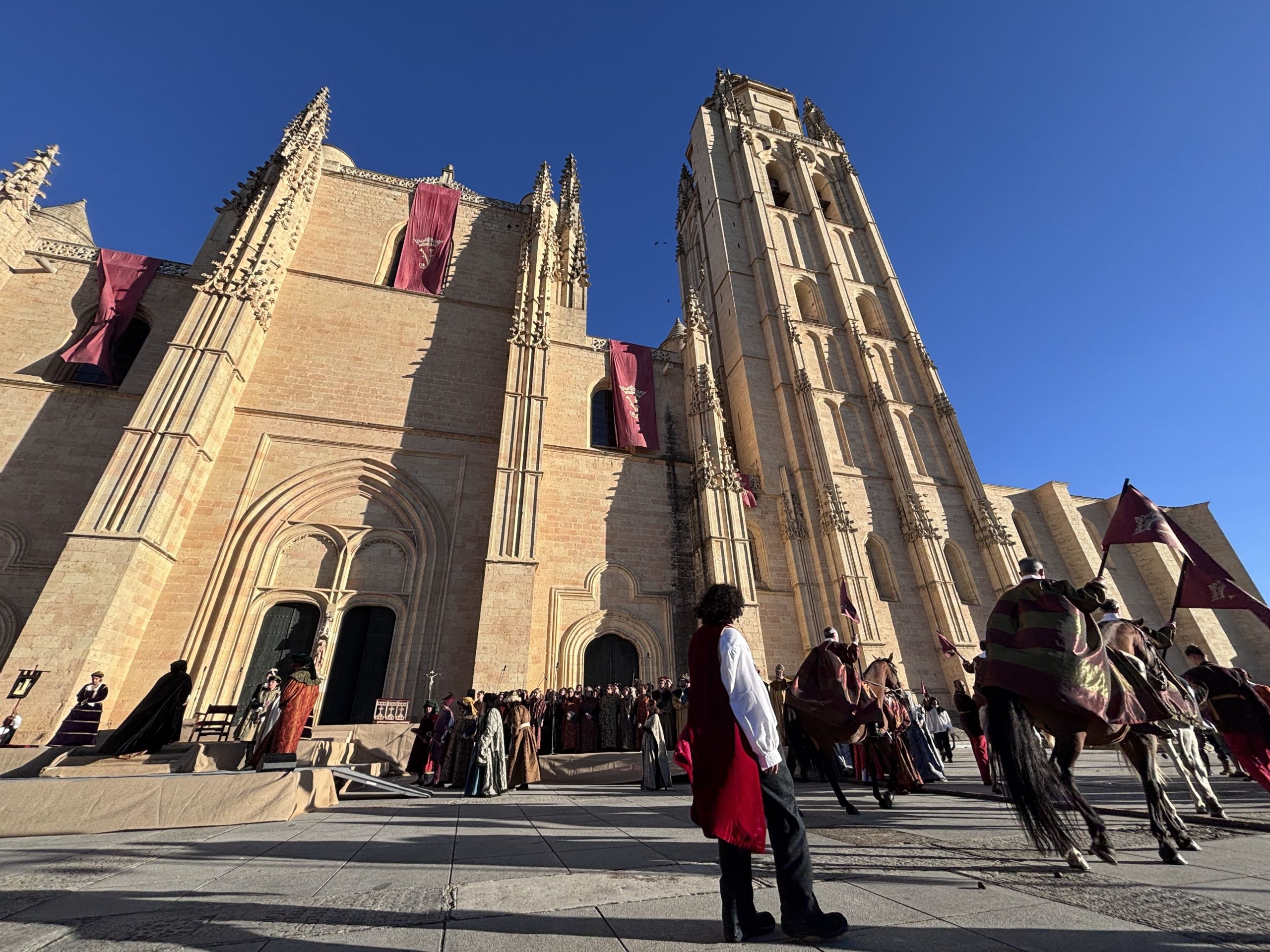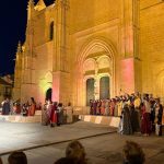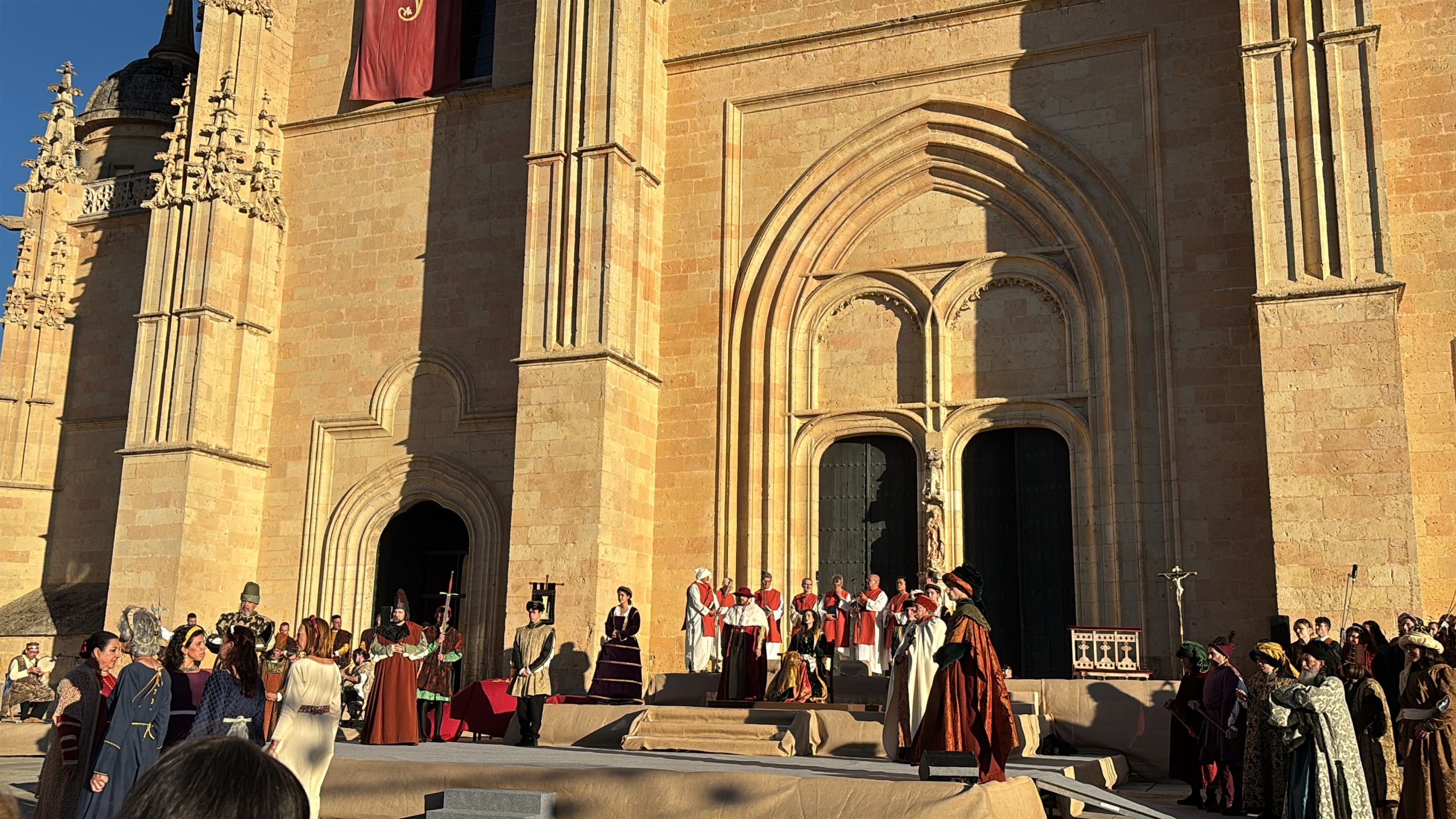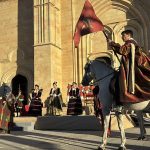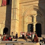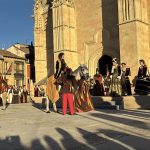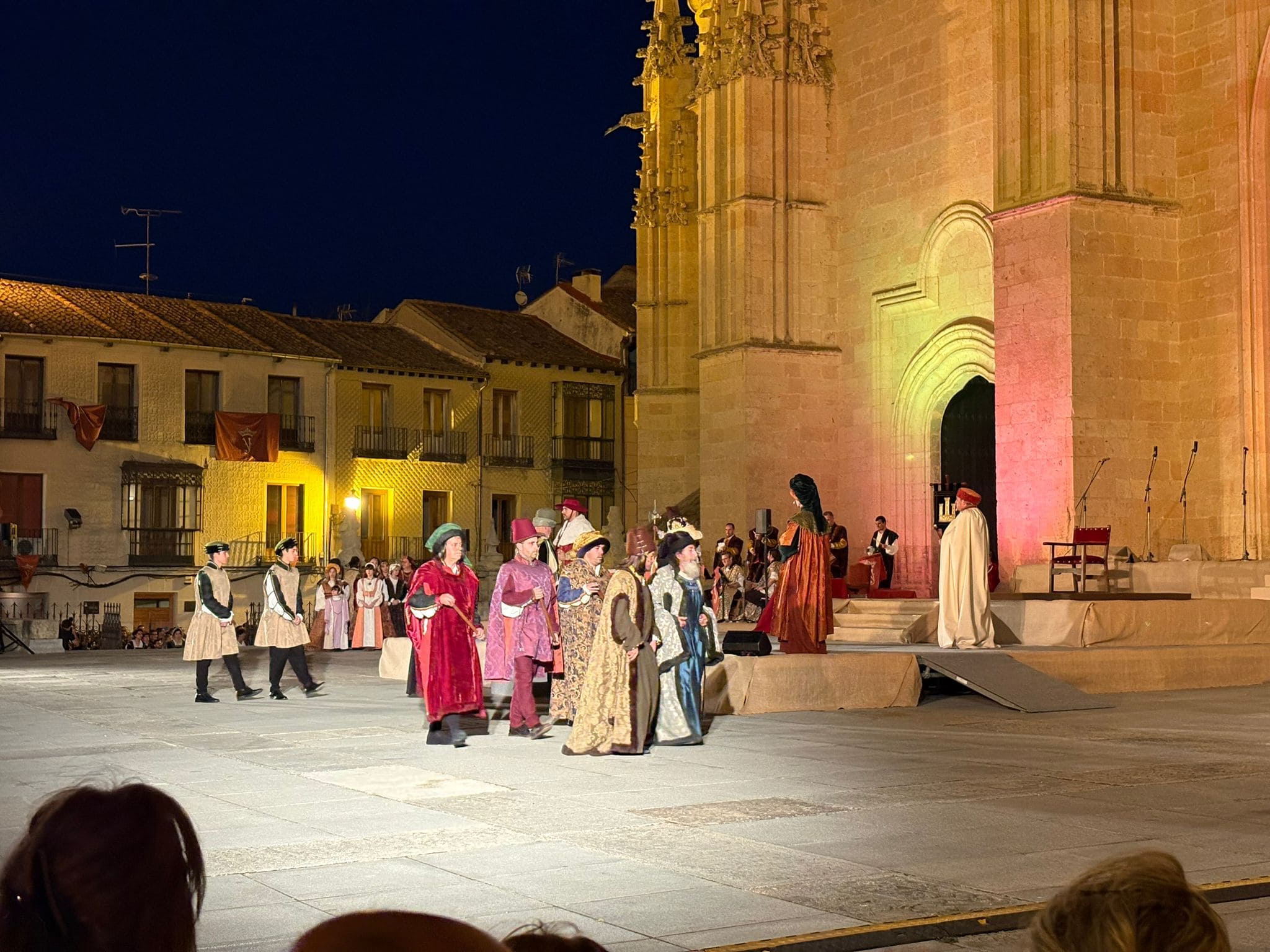 Las imágenes también documentan la Ceremonia de Proclamación celebrada posteriormente en el enlosado de la Catedral, donde la escenografía de época, el vestuario histórico y un elenco de unos 25 personajes en escena, acompañados por juglares y figurantes, recrearon uno de los episodios más relevantes de la historia de Castilla. El conjunto estuvo reforzado por sistemas de sonido, iluminación y elementos escénicos que aportaron realismo y espectacularidad, manteniendo un equilibrio entre el rigor histórico y ciertos elementos de ficción para hacer la recreación especialmente atractiva para el público.