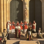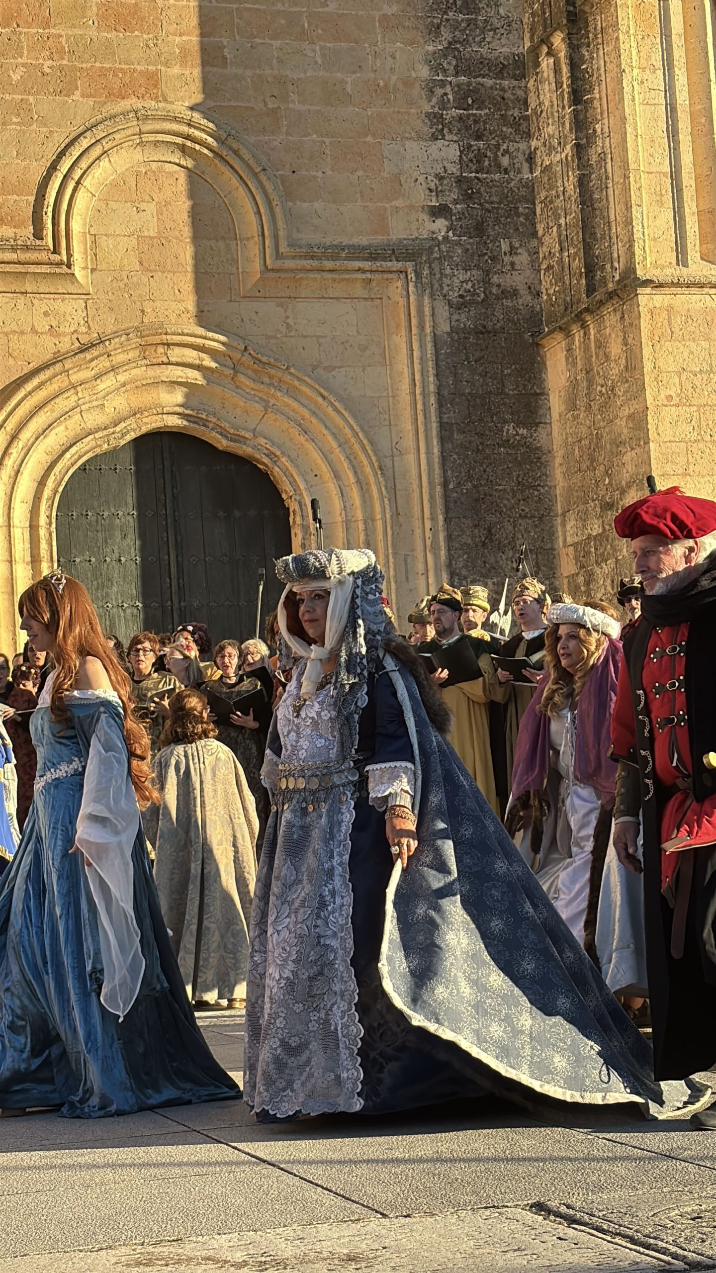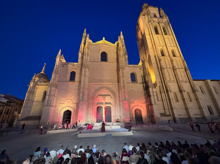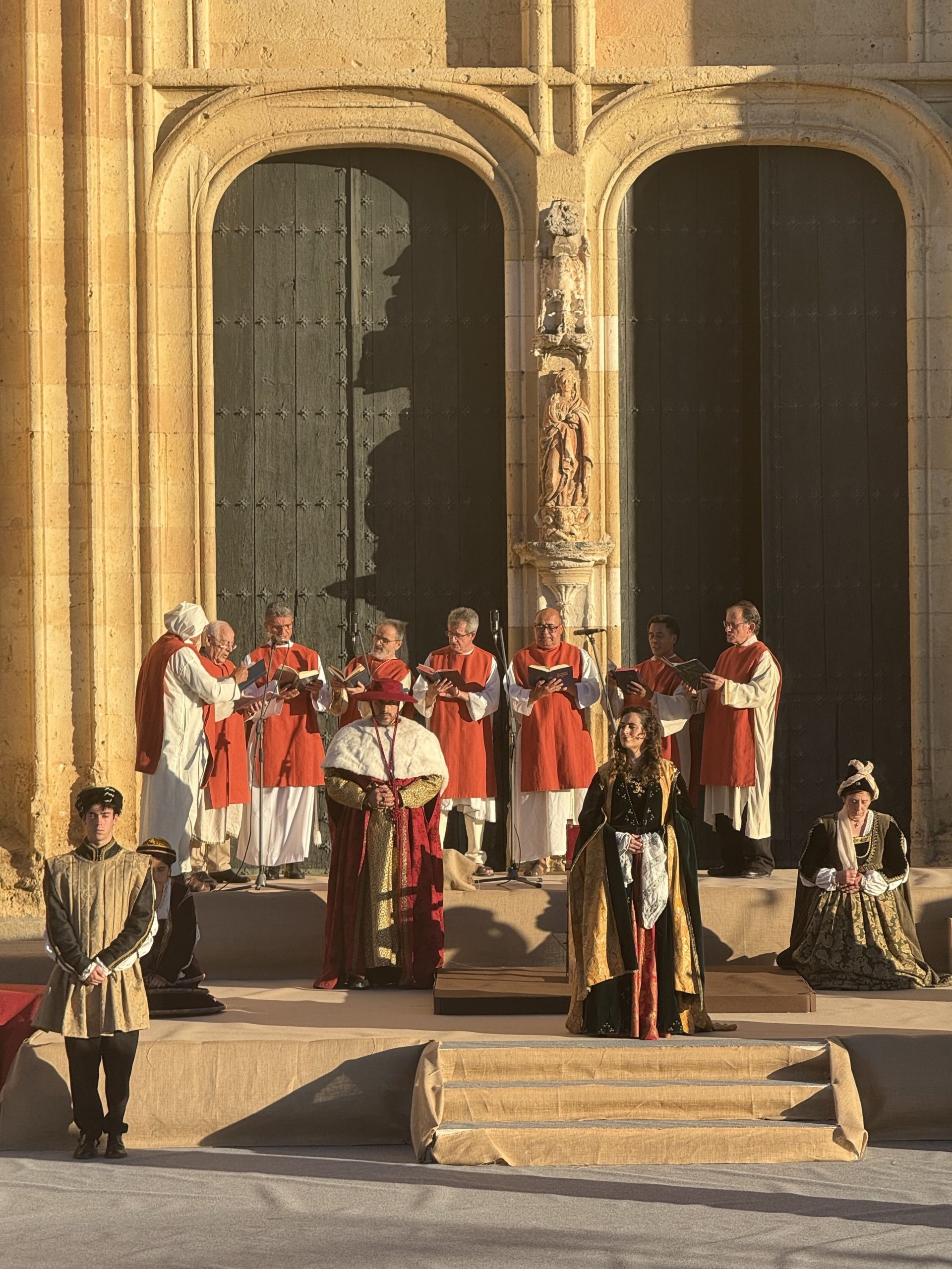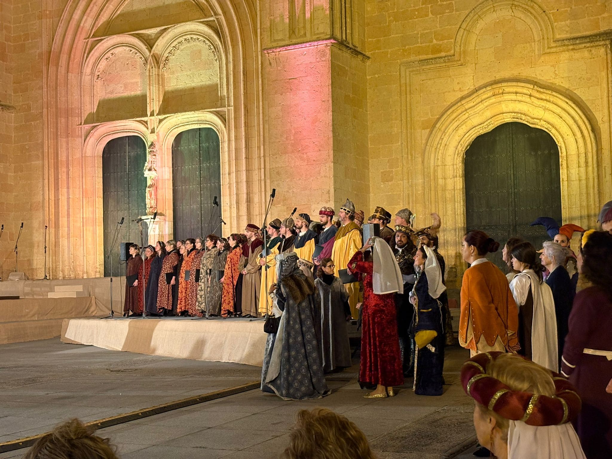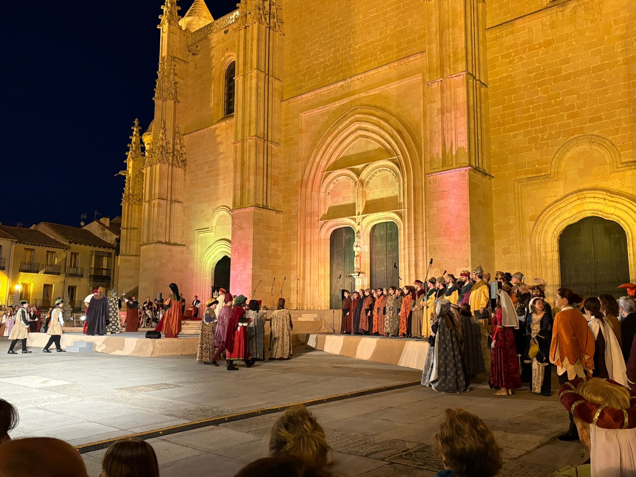 Las imágenes también documentan la Ceremonia de Proclamación celebrada posteriormente en el enlosado de la Catedral, donde la escenografía de época, el vestuario histórico y un elenco de unos 25 personajes en escena, acompañados por juglares y figurantes, recrearon uno de los episodios más relevantes de la historia de Castilla. El conjunto estuvo reforzado por sistemas de sonido, iluminación y elementos escénicos que aportaron realismo y espectacularidad, manteniendo un equilibrio entre el rigor histórico y ciertos elementos de ficción para hacer la recreación especialmente atractiva para el público.