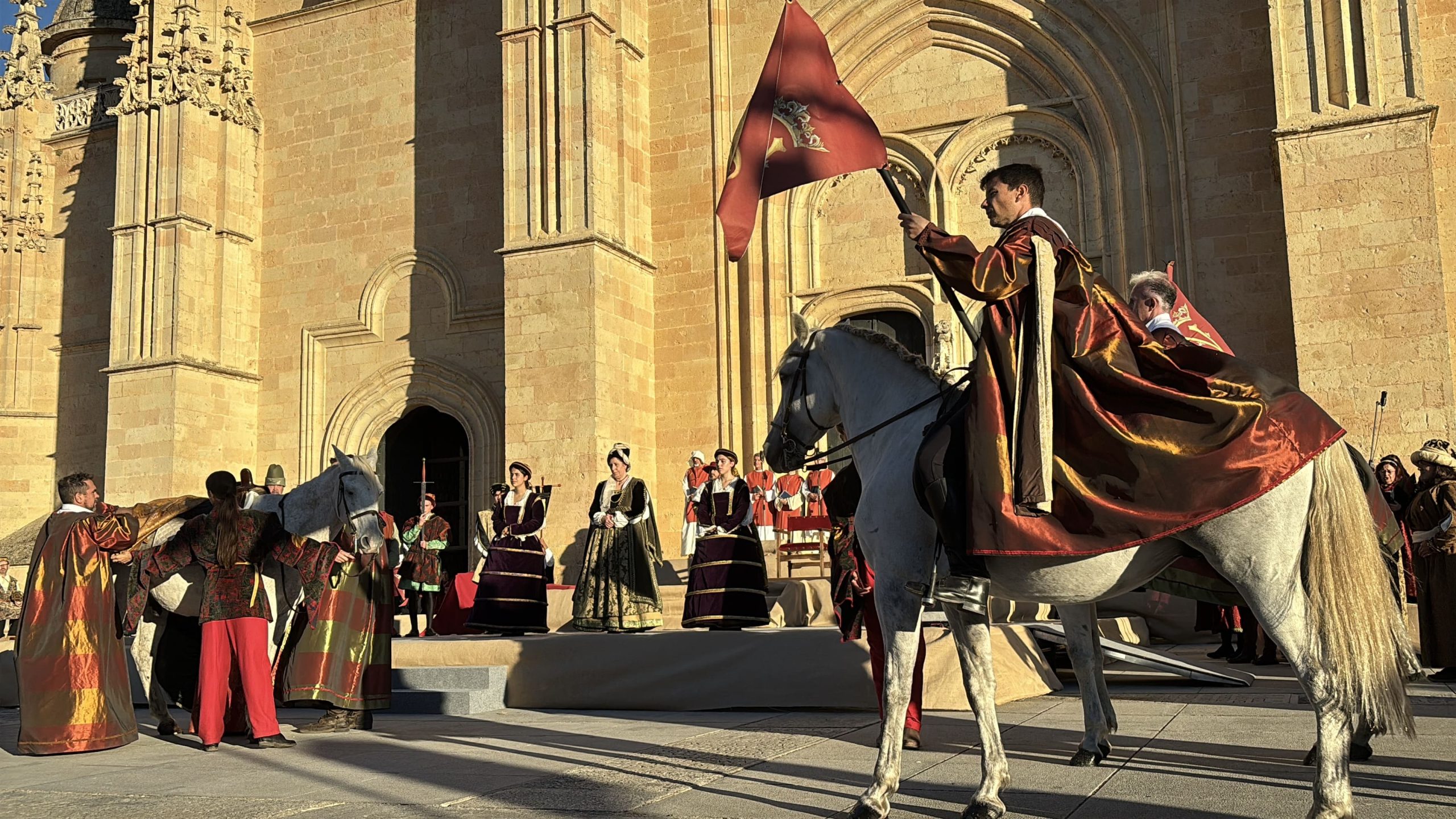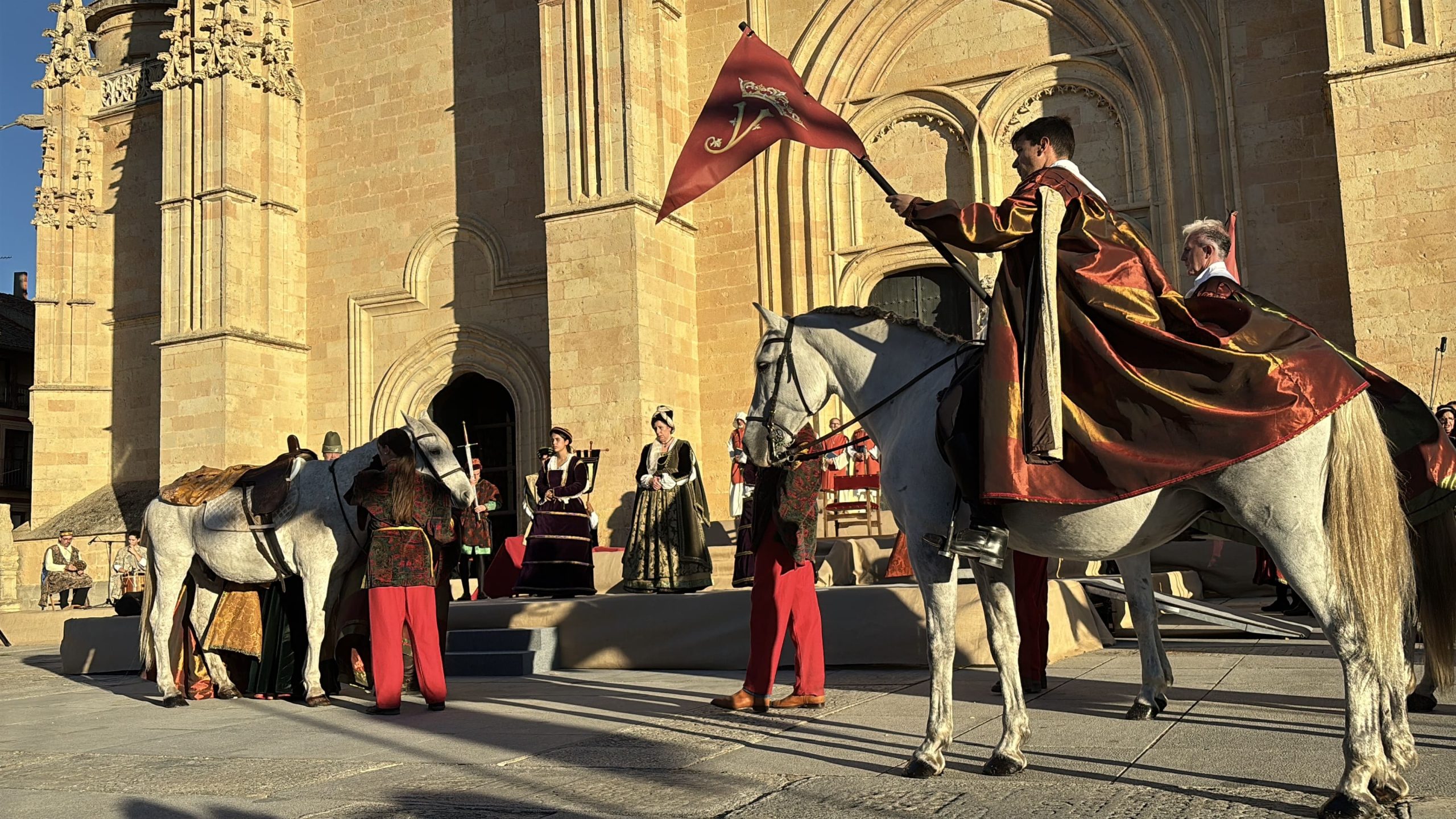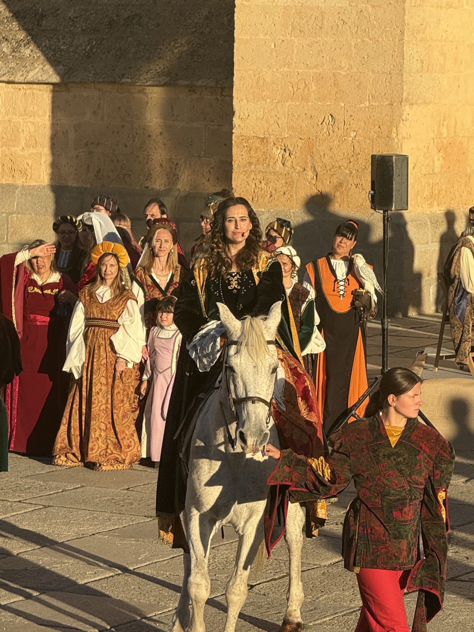 La siguiente galería de imágenes recoge los momentos más destacados de la recreación histórica de la proclamación de la reina Isabel I de Castilla en Segovia, un evento concebido como una ceremonia dividida en dos grandes actos. En primer lugar, las fotografías muestran el paso de la Comitiva Real, que partió a las 17:00 horas desde el Alcázar de Segovia y recorrió algunas de las calles más emblemáticas de la ciudad hasta llegar a la Plaza Mayor. En este desfile participaron alrededor de un centenar de personas —actores, músicos, acróbatas y voluntarios pertenecientes a diversos colectivos segovianos—, con la reina a caballo encabezando el cortejo, creando una estampa solemne y evocadora.